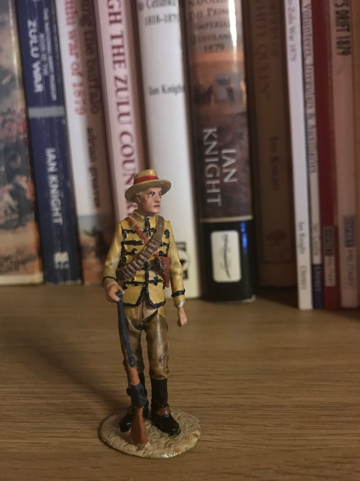 As my Anglo Zulu war book collection expanded I thought my 28mm tank collection looked out of place in front of them ,so a while ago I purchased a few 54mm zulu war figures from Benieto Miiniatures and they stayed in their boxes until last week .With a lot,of time on my hands I got out the one that looked the easiest to build and paint which was atrooper of the Frontier Light Horse one of the many colonial cavalry units involved in the AZW .The figure went together realy well and I think I have done a semi decent job on him ,I have ordered some display plinths for my little collection fothem to stand guard over my book collection which is nearly 70 strong including some nice little collectables which I have picked up cheaply , also to fill the shelf my good friend John bought me a replica 24th foot helmet which has found a place in front of the books .